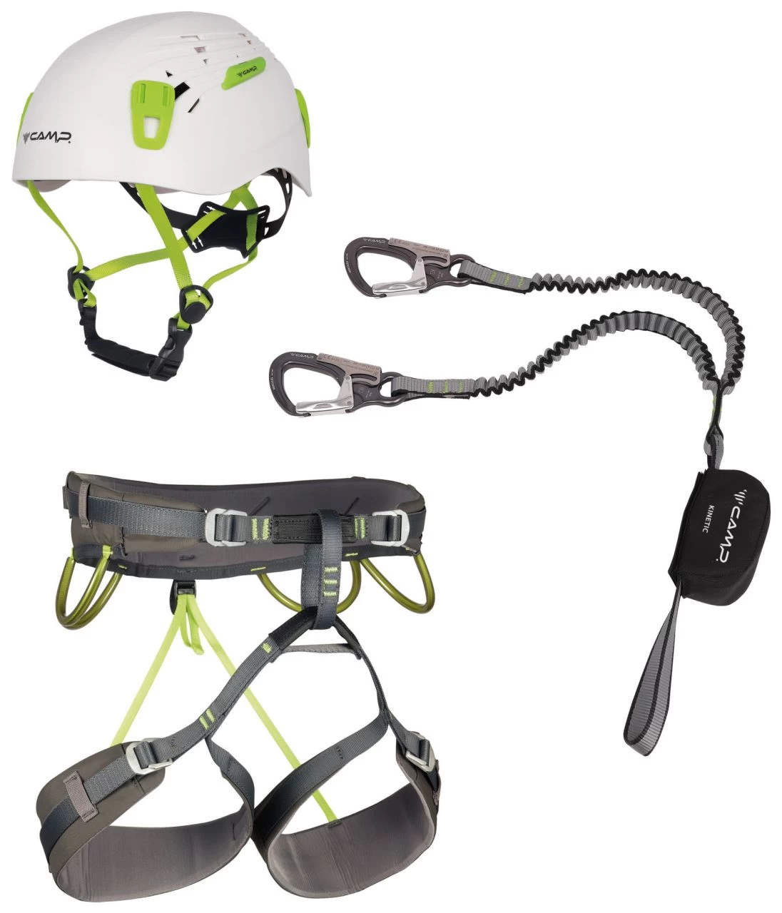 Das Kit Ferrata Kinetic Rewind Energy Cr 4 von CAMP besteht aus dem Klettersteig – Set Kinetic Rewind, dem Klettergurt Energy Cr 4 und dem Helm Titan.
