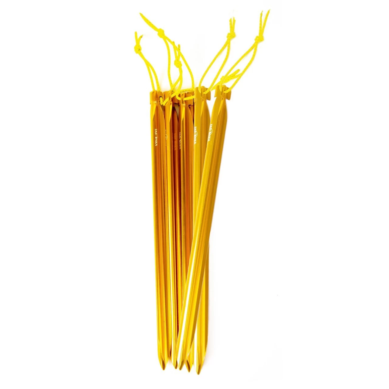 Der Zelthering Pro von TATONKA ist in gut sichtbarem Gold und mit Schlaufe zum Herausziehen käuflich. Er ist erhältlich im 6er-Pack.